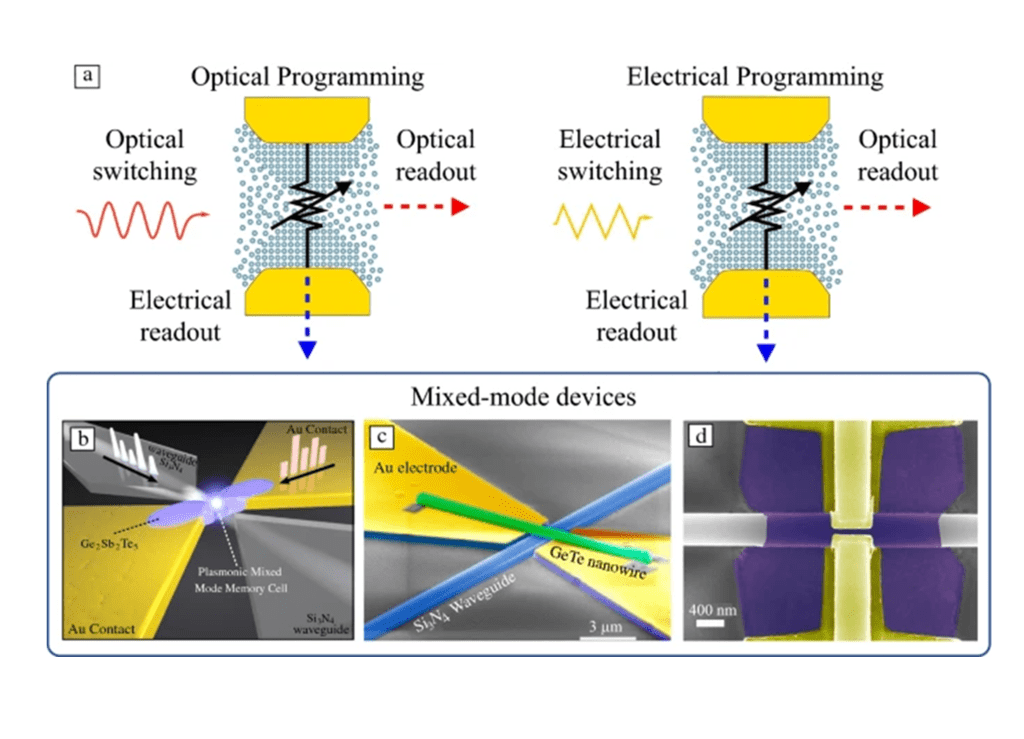 The ever-increasing demands for data processing and storage will require seamless monolithic co-integration of electronics and photonics. The extreme size disparity however between CMOS electronics and dielectric photonics inhibits the realization of efficient and compact electrically driven photonic switches, logic and routing elements. The Fun-COMP team have however recently reached an important milestone in harmonizing the two domains, by demonstrating an electrically reconfigurable, ultra-compact and nonvolatile memory that is optically accessible. The platform relies on localized heat, generated within a plasmonic structure; this uniquely allows for both optical and electrical readout signals to be interlocked with the material state of the PCM while still ensuring that the writing operation is electrically decoupled. Through miniaturization and effective thermal engineering, the Fun-COMP team also achieved unprecedented energy efficiency, opening up a path towards low-energy optoelectronic hardware for neuromorphic and in-memory computing. The work was recently reported in the journal Advanced Science, see https://onlinelibrary.wiley.com/doi/10.1002/advs.202200383
